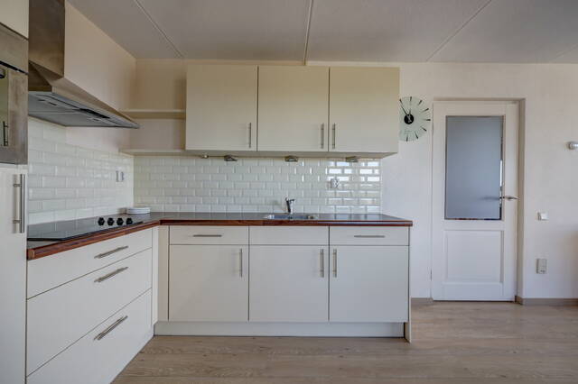 De open keuken in L-opstelling is modern uitgevoerd en voorzien van diverse inbouwapparatuur, waaronder een vaatwasser, combimagnetron, koelkast en kookplaat met afzuigkap. Hier kook je met plezier terwijl je in contact blijft met je partner of gasten.
