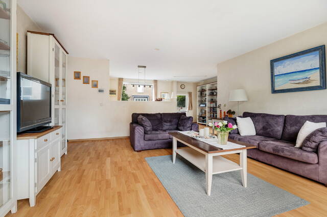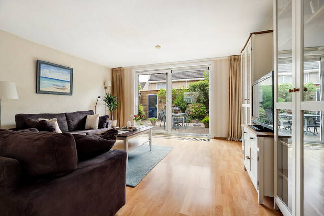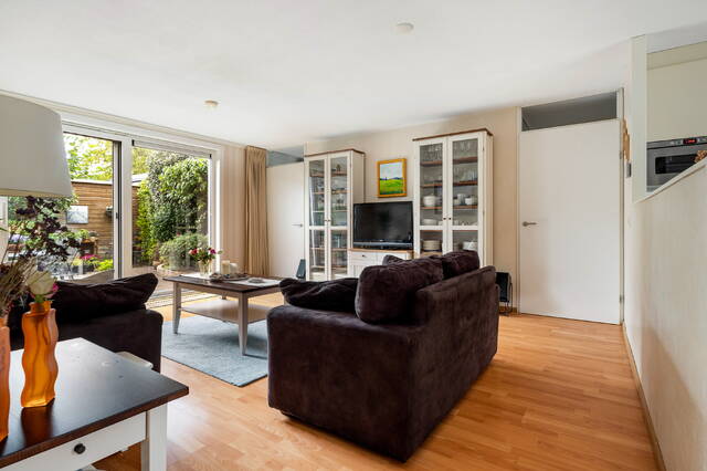 De tuingerichte woonkamer (ca. 25 m²) is licht en ruimtelijk dankzij de grote raampartijen en de schuifpui met hordeur richting de zonnige achtertuin. Verwarming vindt plaats via een convectorput bij de schuifpui.