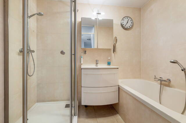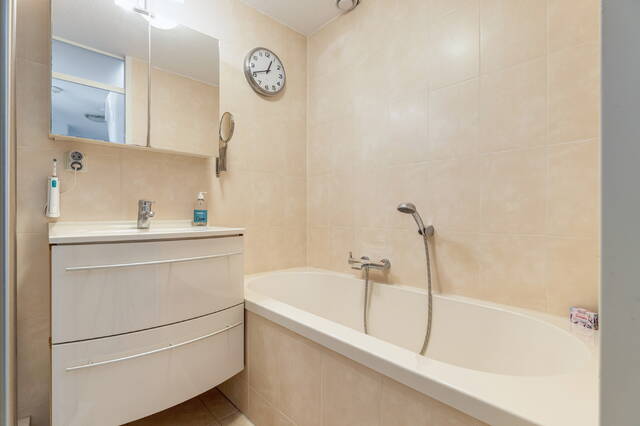 De badkamer (ca. 4 m²) is compleet uitgevoerd met een ligbad, een aparte douchecabine en een wastafelmeubel. Geheel betegeld in een neutrale beige kleurstelling.