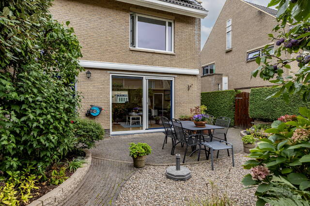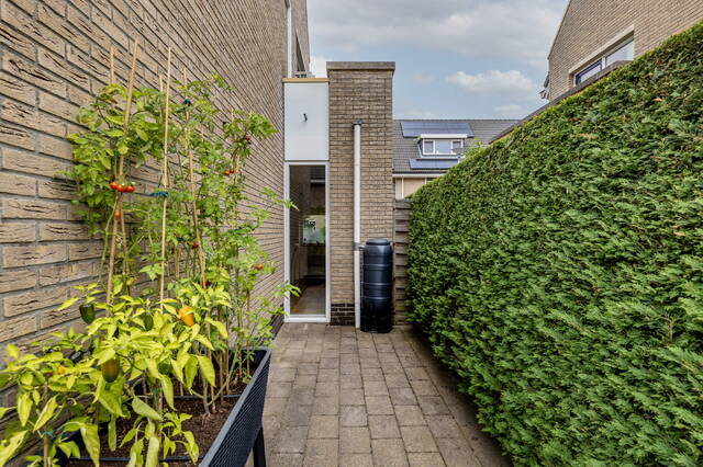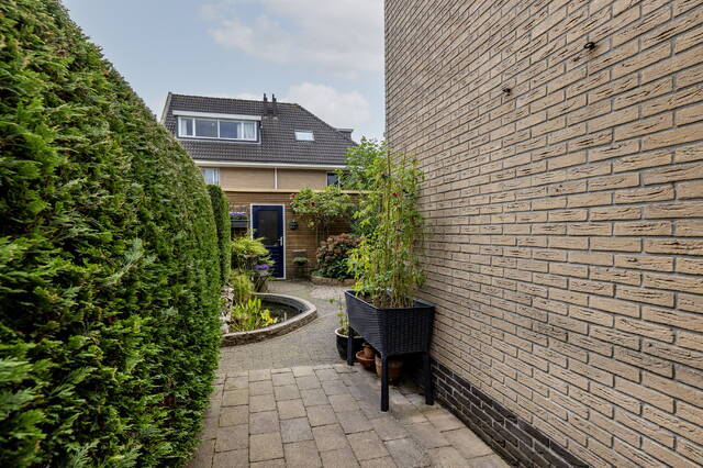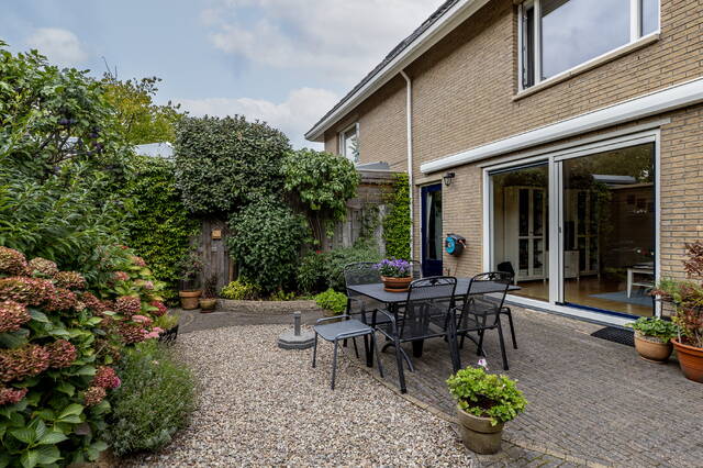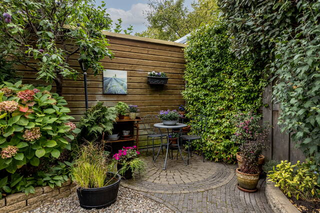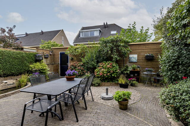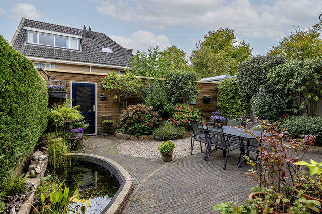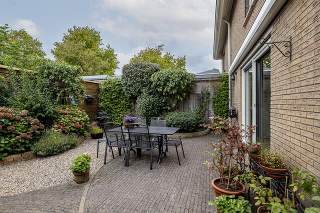 De achtertuin op het zuidwesten is een waar paradijs. Sfeervol aangelegd met sierbestrating, veel groen en bloeiende planten. Dankzij de beschutte ligging geniet u hier van optimale privacy. Er is een vijver en een elektrisch zonnescherm voor extra comfort. De tuin is ook bereikbaar middels een deur aan de zijkant.
