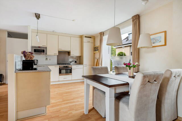 Aan de voorzijde bevindt zich de ruime open keuken (ca. 18 m²), uitgevoerd in een lichte kleurstelling met kunststof aanrechtblad. De keuken is opgesteld in een hoek en voorzien van een koel/vriescombinatie, oven, magnetron, vaatwasser en een 4-pits gaskookplaat met geïntegreerde afzuiging. De uitbouw aan de zijkant geeft een speels effect en zorgt voor extra wooncomfort. Door deze extra ruimte is er plaats genoeg voor een gezellige eethoek.