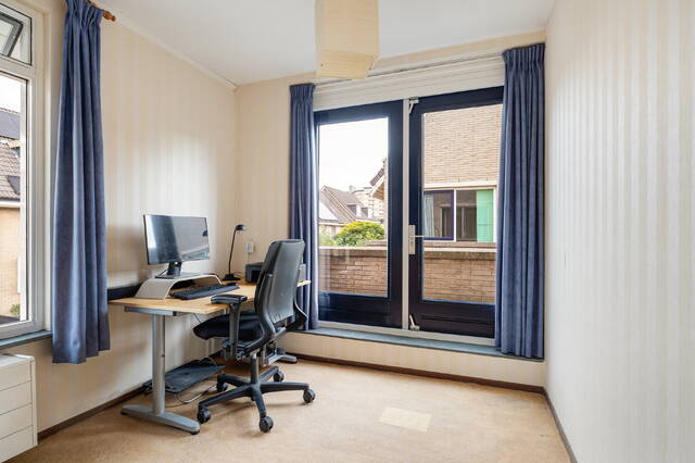 Slaapkamer 3 (ca. 8 m²), eveneens aan de voorzijde, met toegang tot het balkon via openslaande deuren.