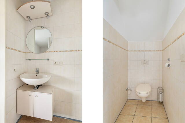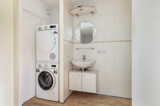 Op de overloop vindt u de aansluitingen voor wasmachine en droger, een vaste wastafel, en een praktische kast met veel bergruimte en de opstelplaats voor de CV-ketel, de mechanische ventilatie en de omvormer van de zonnepanelen. Hier bevindt zich ook een tweede toilet (hangend model, Sanibroyeur).