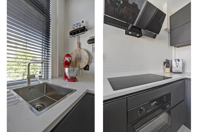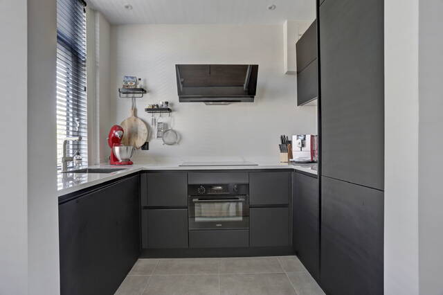 Via de overloop bereikt u de woonkamer, het toilet en de trap naar de tweede verdieping. Er is ruimte voor een garderobe en een praktische nis voor schoenen. De woonkamer is licht en sfeervol dankzij de erker aan de voorzijde en de ramen aan beide kanten. Aan de voorzijde bevindt zich de moderne zwarte U-vormige keuken met marmerlook keramiek aanrechtblad en hoogwaardige inbouwapparatuur zoals een koel-vriescombinatie, vaatwasser, combi-oven en een brede inductiekookplaat met stijlvolle afzuigkap. De Lemans carrousselkast zorgt voor slimme opbergruimte. De keuken heeft een plavuizenvloer, terwijl de rest van de verdieping is afgewerkt met laminaat. Het separate toilet is modern uitgevoerd met hangend closet, lichtgroene behang en glad stucwerk.