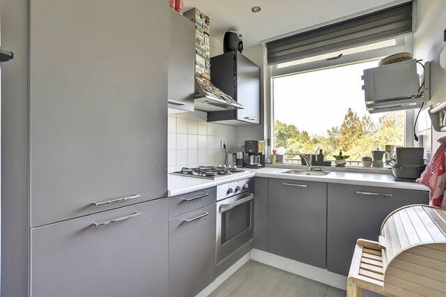 Aan de voorzijde bevindt zich de nette keuken. Deze is efficiënt ingericht en voorzien van alle gemakken, waaronder een 4-pits gasfornuis, oven, vaatwasser en een koel-/vriescombinatie. De keuken biedt voldoende opbergruimte en nodigt uit tot het bereiden van de lekkerste gerechten.