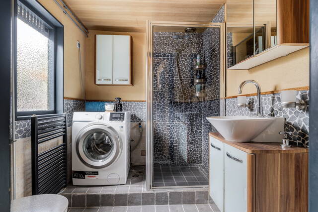 Vanuit de tussenhal heeft u toegang tot de badkamer (ca. 4 m²), voorzien van een douchecabine, duoblok toilet, wastafelmeubel met spiegelkast en aansluiting voor de wasmachine. In de tussenhal bevindt zich ook de kast met de CV-opstelling.