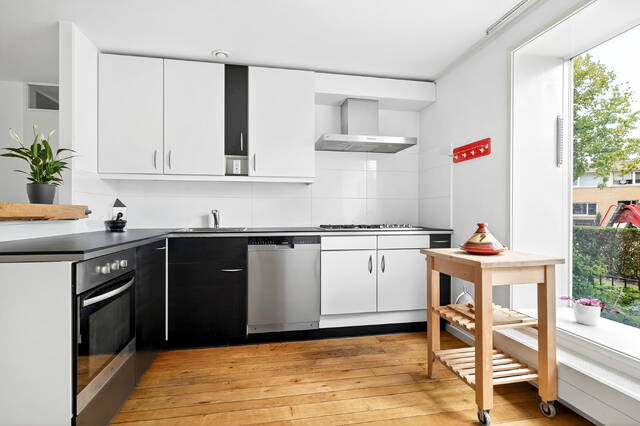 De keuken (ca. 13 m²) aan de voorzijde biedt een fijn uitzicht over de groenstrook met de speeltuin en is uitgevoerd in een hoekopstelling met diverse inbouwapparatuur: een koelkast, oven, magnetron, vaatwasser en een 5-pits gaskookplaat met RVS afzuigkap. De grote raampartijen zorgen voor veel daglicht.