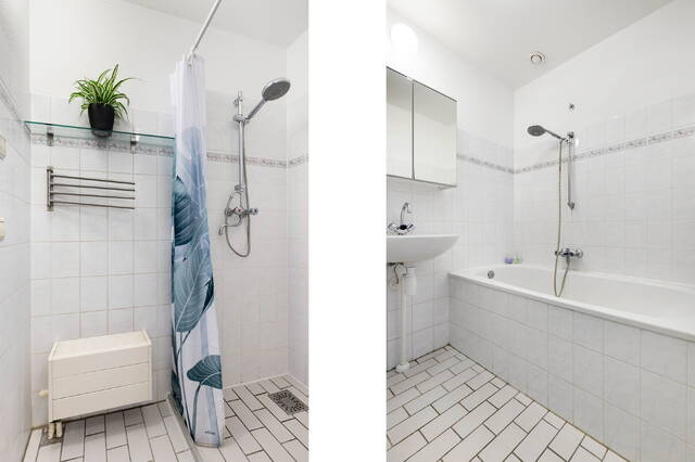 De badkamer (ca. 4 m²) is eveneens licht en netjes uitgevoerd en beschikt over een ligbad, een aparte douchecabine en een vaste wastafel.