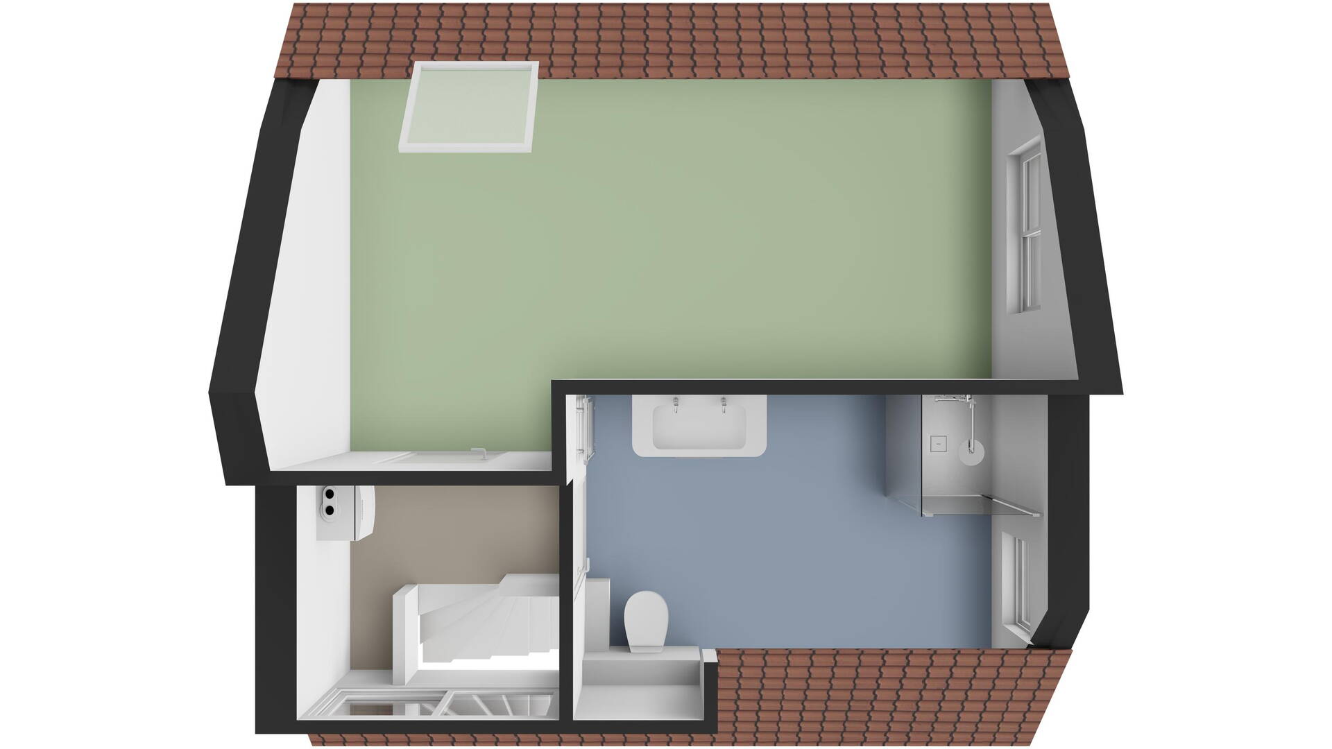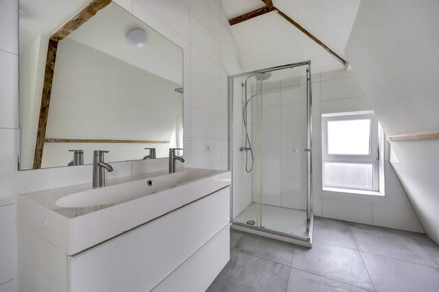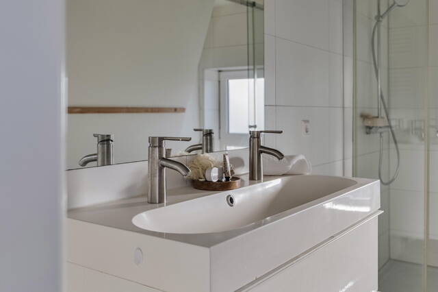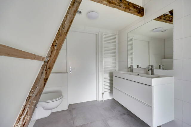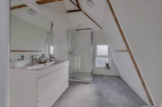 Daarnaast bevindt zich op deze verdieping de badkamer, voorzien van een grote douchecabine met zowel regen- als handdouche, een tweede toilet, een dubbele wastafel met mengkranen, een grote spiegel en een strak