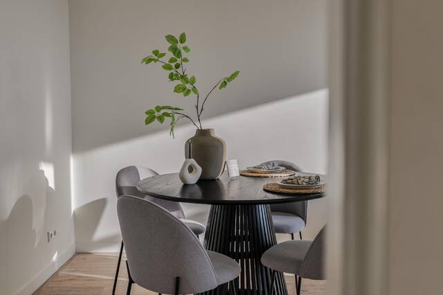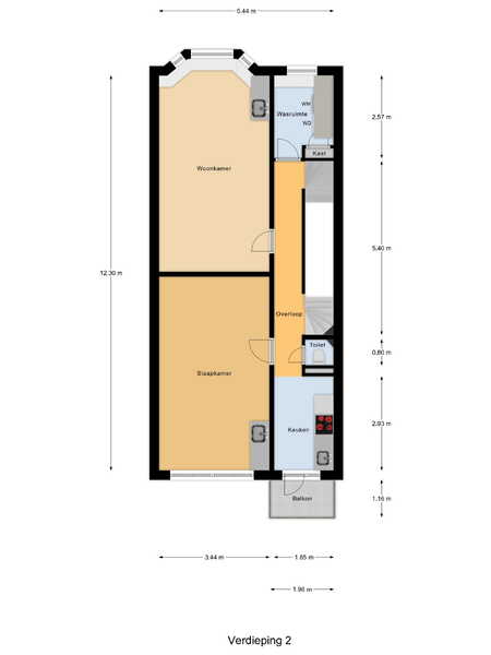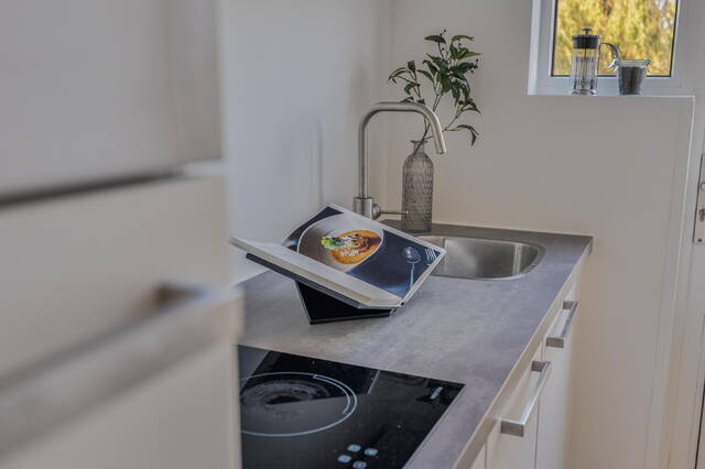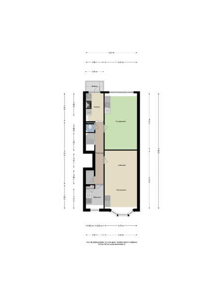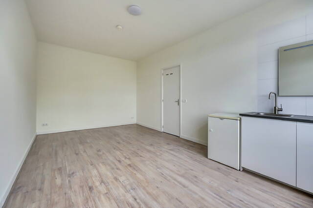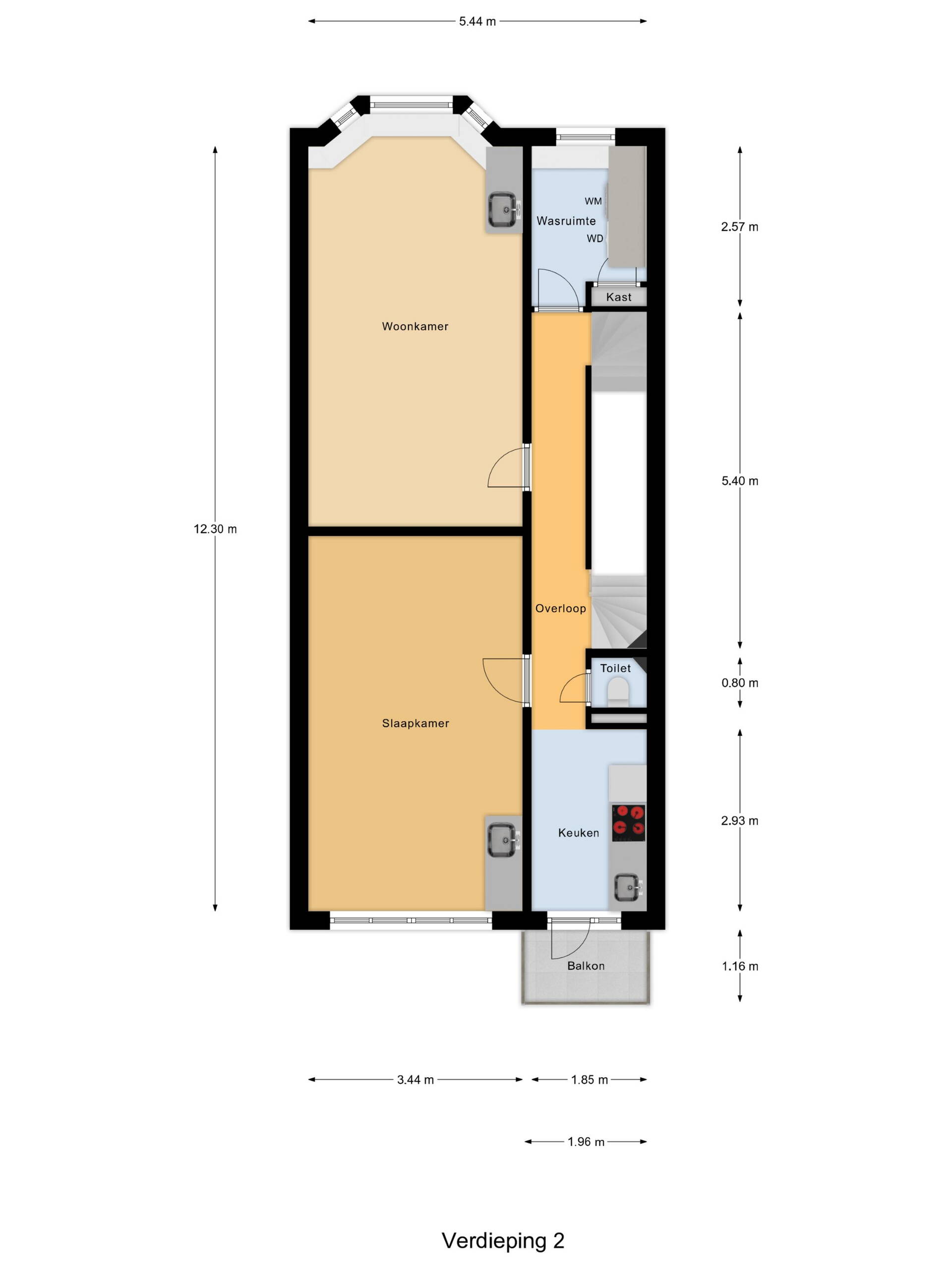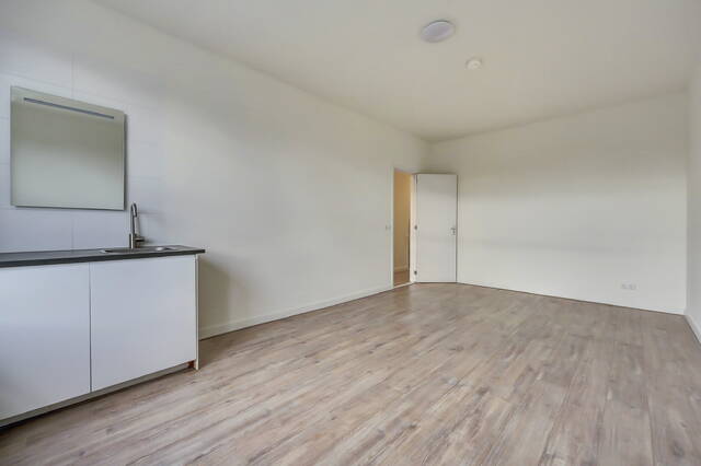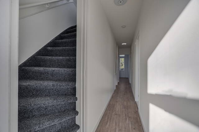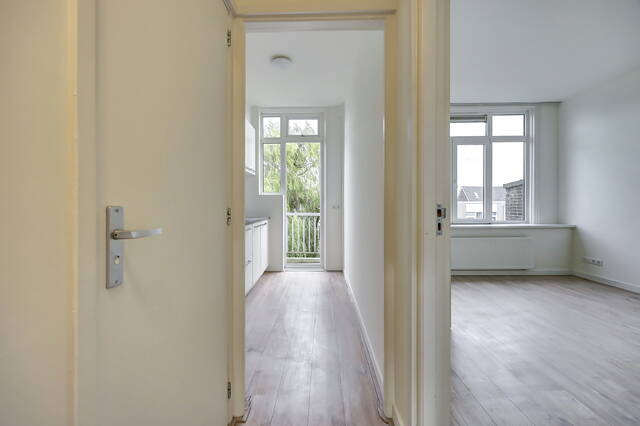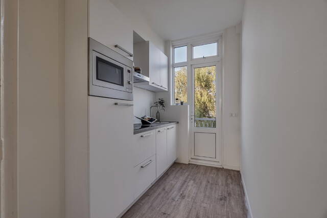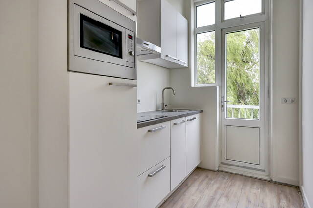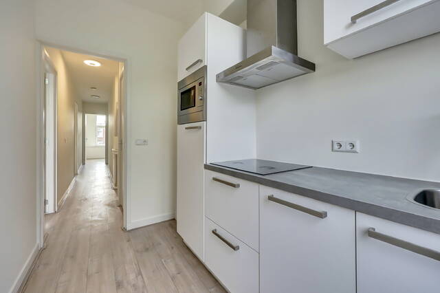 De muur tussen de voor- en achterkamer is eenvoudig te verwijderen, wat een prachtige, grote doorzonwoonkamer oplevert. Aan de achterzijde bevindt zich vanuit de hal de keuken, voorzien van een ingebouwde koelkast en oven: een nette, moderne keuken met toegang tot het balkon aan de achterzijde.