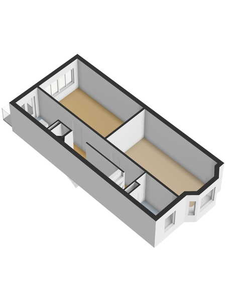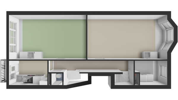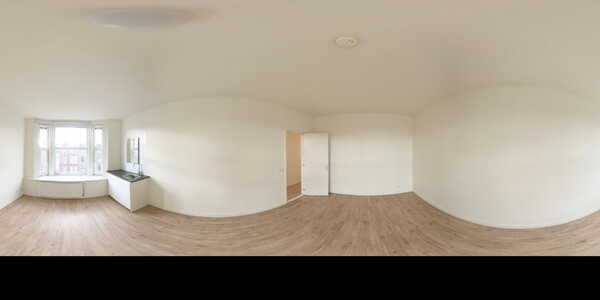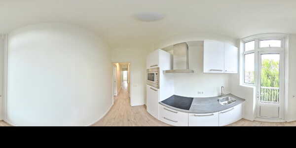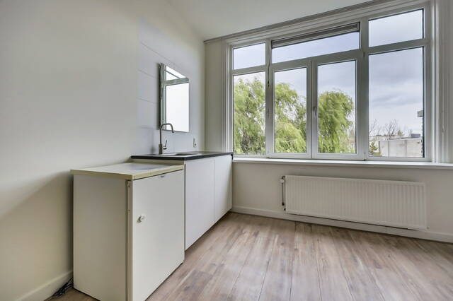 Achter de voordeur leidt de trap naar de derde etage, waar je aankomt in de hal die toegang geeft tot iedere ruimte op deze verdieping. Deze verdieping bestaat uit een riante voorkamer van ca. 23 m² en een grote achterkamer van ca. 19 m². Dit appartement is voorheen verhuurd geweest, waarbij er drie ruime kamers waren met een eigen keuken. De keukens zijn blijven zitten; je zou hier dus ook perfect met z’n drieën kunnen wonen, waarbij je het toilet en de badkamer deelt, maar ieder een eigen keukenblokje hebt en daarnaast een gezamenlijke keuken. Uiteraard kunnen de keukenblokjes er ook eenvoudig uit, zodat je het appartement als geheel kunt bewonen — alleen, met z’n tweeën of met je gezin.