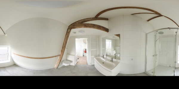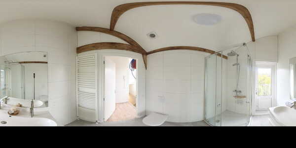 badkamermeubel. Het hoge plafond maakt dit tot een bijzonder sfeervolle ruimte!
