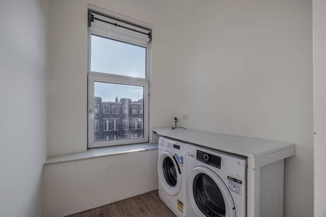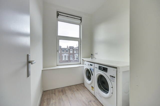 Aan de voorzijde bevindt zich een kleinere kamer, voorzien van aansluitingen voor de wasmachine en droger.