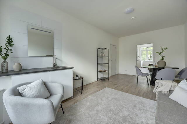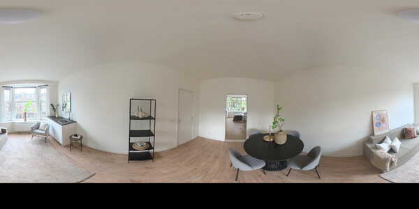 Je komt binnen in een kleine hal en hebt van daaruit direct toegang tot zowel het toilet, de keuken aan de achterzijde als de woonkamer. We stappen de woonkamer en-suite in, waar je aan de achterkant een heerlijke ruimte hebt om een grote eethoek te creëren — fantastisch om lange avonden te tafelen met vrienden en/of familie. Je zou er ook voor kunnen kiezen om de scheidingswand tussen de voor- en achterkamer te verwijderen, zodat je een royale doorzonwoonkamer krijgt.
