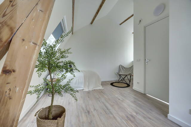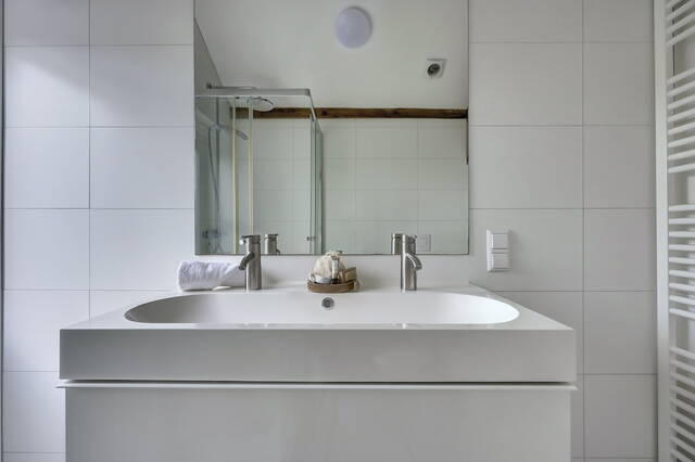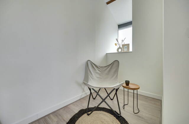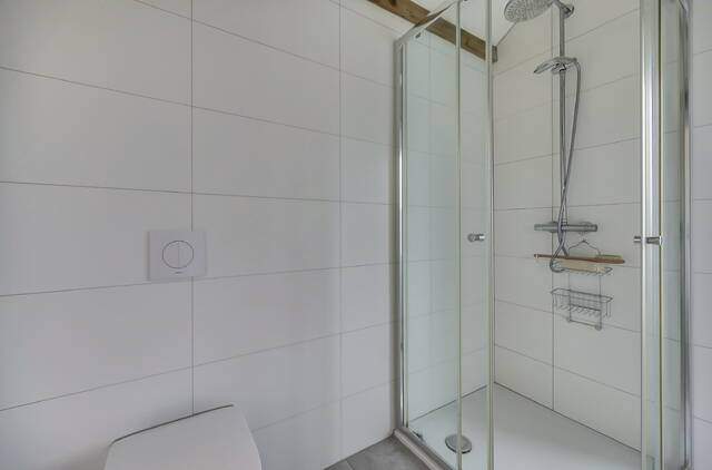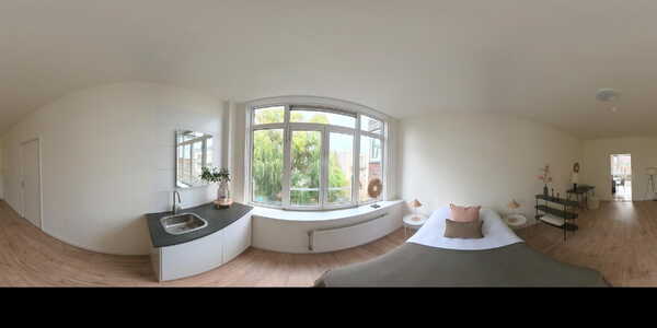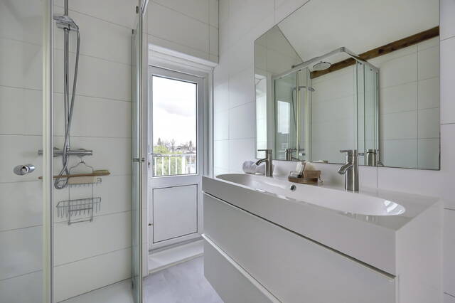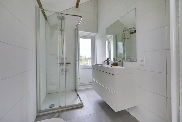 Daarnaast vinden we op deze etage de badkamer, die is voorzien van een grote douchecabine met zowel regendouche als handdouche, een tweede toilet, een dubbele wastafel met mengkranen, een grote spiegel erboven en een strak badkamermeubel. Ook vanuit de badkamer heb je toegang tot het balkon. De hoogte van het plafond maakt dit een bijzonder sfeervolle ruimte!