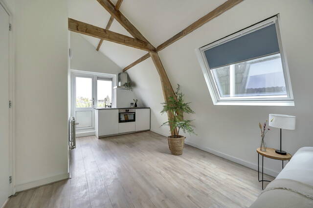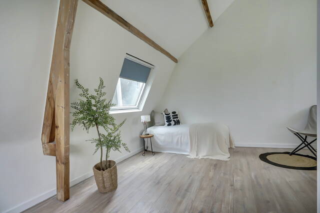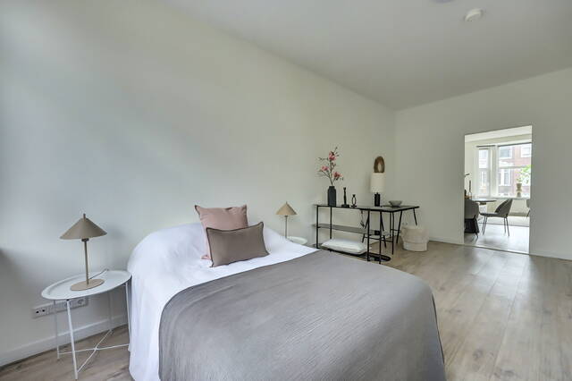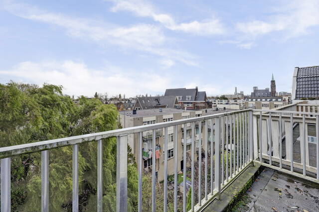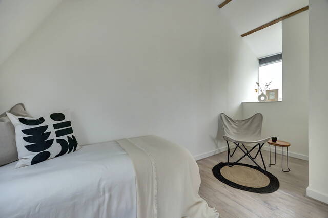 Met de trap lopen we naar de vierde verdieping, waar je beschikt over de achterste helft van de etage. Daar treffen we een sfeervolle slaapkamer met ruimte voor een groot tweepersoonsbed en voldoende plek voor kledingkasten. Vanuit deze kamer heb je toegang tot het balkon aan de achterzijde, dat ligt op het noorden — een fijn plekje om in de ochtend te genieten van een kop koffie in de zon!