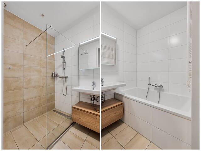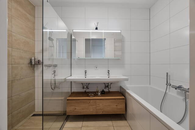 Moderne badkamer 1 (ca. 6 m²) met sanitaire voorzieningen zoals dubbele wastafels met wastafelmeubel, spiegel met spiegelkast en verlichting, ligbad, inloopdouche en designradiator. Deze badkamer is geheel betegeld met witte wandtegels, en een lichtgrijze tegelvloer afgewerkt met vloerverwarming en koeling systeem.