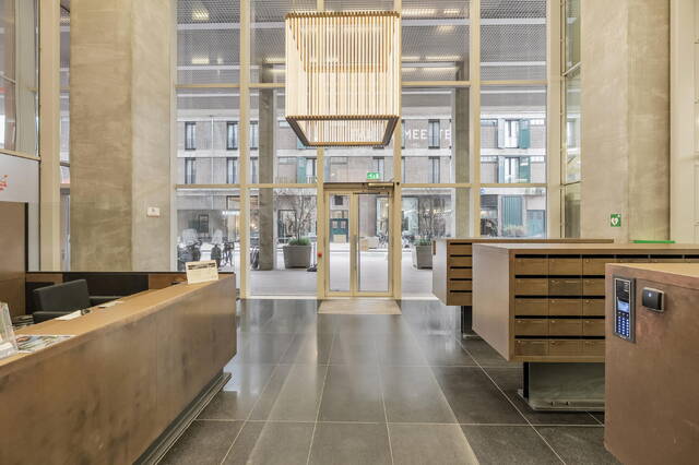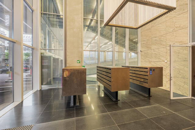 Entree met video-intercomsysteem. Gesloten centrale hal met receptionist, 3 snelle liften en trappenhuis.