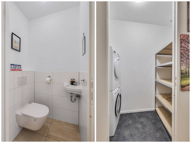 Wasruimte/voorraadkast (ca. 2 m²) voorzien van aansluiting voor wasmachine en droger. De wasruimte is afgewerkt met zeilvloer.