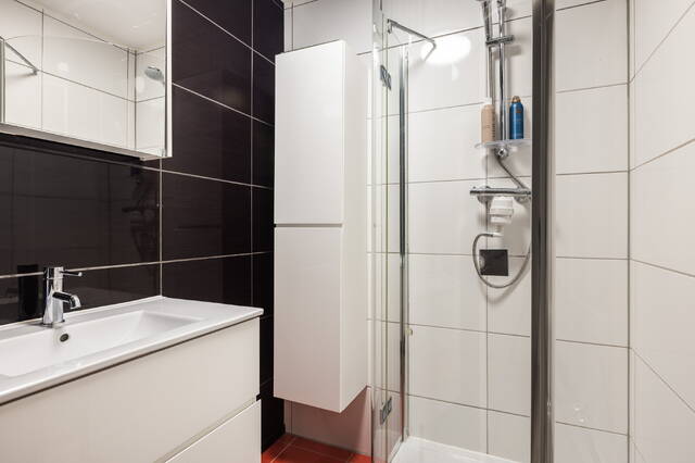De badkamer is geheel betegeld en uitgerust met een douchecabine en een wastafelmeubel. Ook beschikt het appartement over een eigen grote berging in de onderbouw.