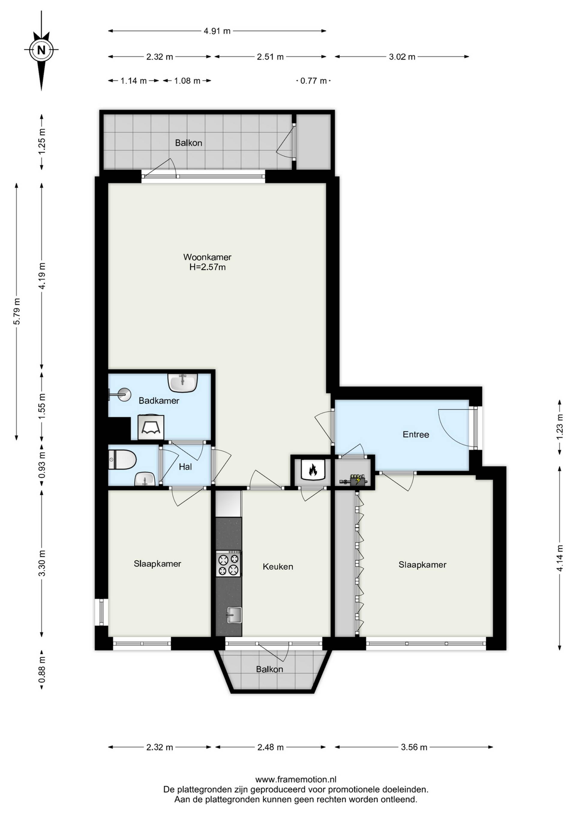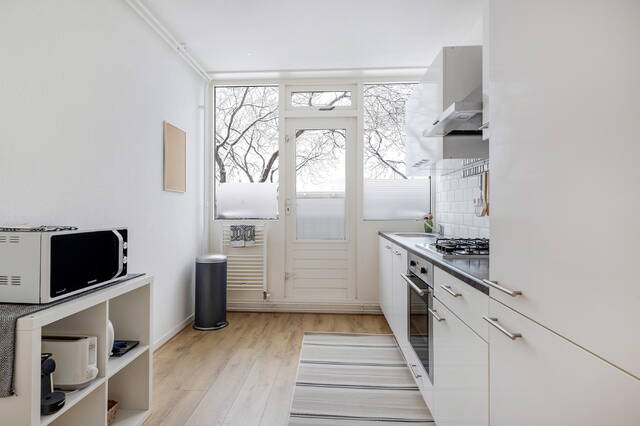 De dichte keuken heeft een rechte opstelling en is uitgevoerd in een moderne wit-grijze kleurstelling. De keuken is voorzien van een 4-pits gaskookplaat, afzuigschouw en koel-vriescombinatie. Tevens bevindt zich hier een designradiator en is er toegang tot het balkon aan de achterzijde. In een vaste kast bevindt zich de cv-installatie (Intergas, 2021).