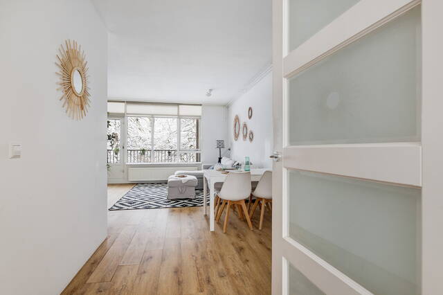De lichte woonkamer is gelegen aan de voorzijde en beschikt over grote raampartijen, wat zorgt voor een prettige lichtinval. Vanuit de woonkamer is er toegang tot het balkon aan de voorzijde.