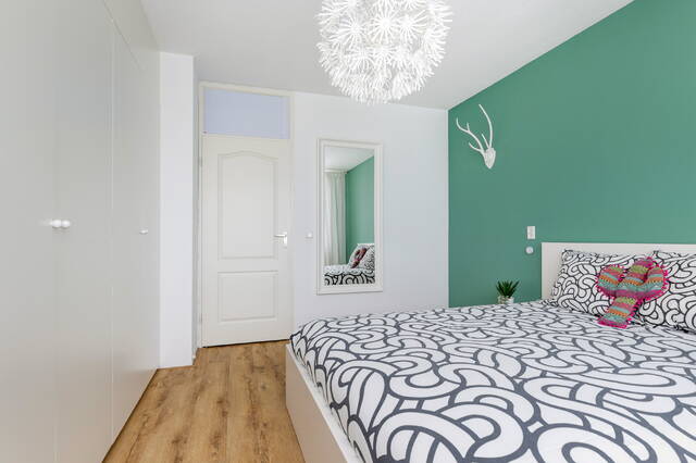 De tweede slaapkamer beschikt over ramen aan twee zijden, wat zorgt voor veel licht en een ruimtelijk gevoel.