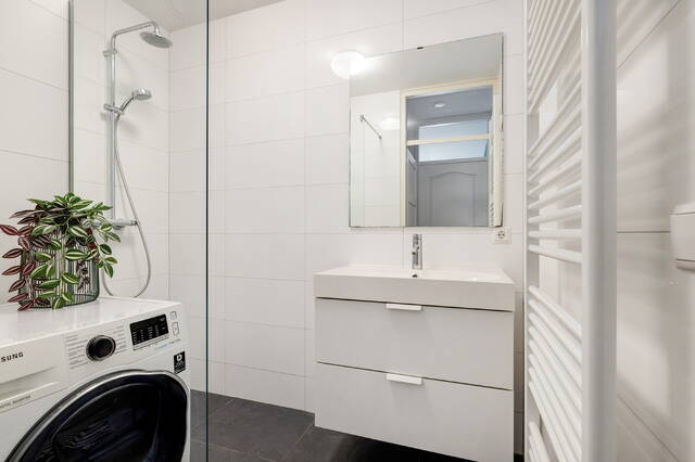 Via een tussenhal zijn de separate toiletruimte en de badkamer bereikbaar. De toiletruimte is half betegeld en voorzien van een zwevend toilet en fonteintje. De badkamer beschikt over een douche, wastafelmeubel, designradiator en aansluiting voor de wasmachine, uitgevoerd in een nette wit-grijze kleurstelling.