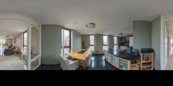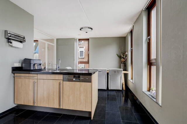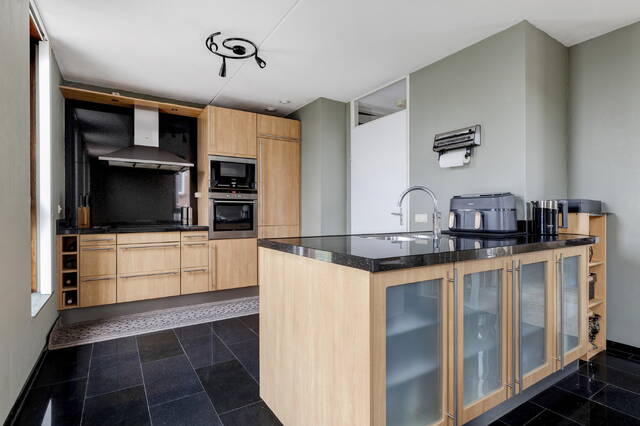 De woonkeuken is bereikbaar vanuit zowel de woonkamer als de hal. Deze royale eetkeuken beschikt over een rechte wandopstelling en een apart spoeleiland, uitgevoerd in hout met een zwart granieten werkblad. De keuken is compleet uitgerust met een koel-/vriescombinatie, vaatwasser, oven, magnetron en een 4-pits keramische kookplaat met RVS afzuigkap. Er is ruim voldoende plaats voor een grote eettafel. De donkere granieten vloer met vloerverwarming maakt het geheel stijlvol en comfortabel.