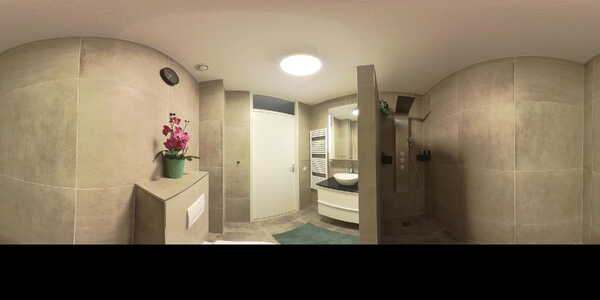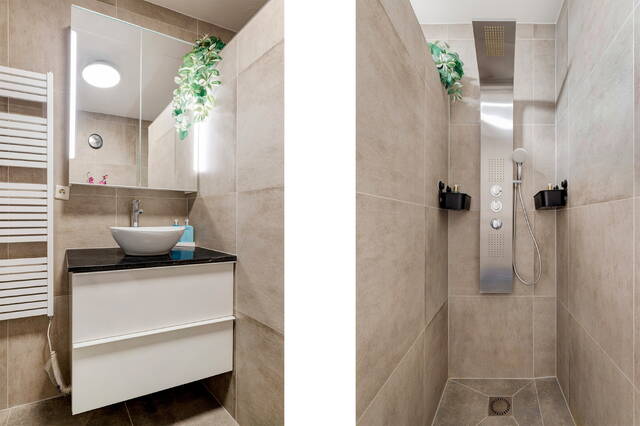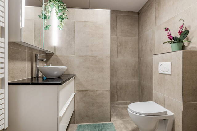 De badkamer (2023) is modern uitgevoerd en volledig betegeld in grijstinten. Voorzien van een inloopdouche, wastafelmeubel met spiegelkast en een hangend toilet.