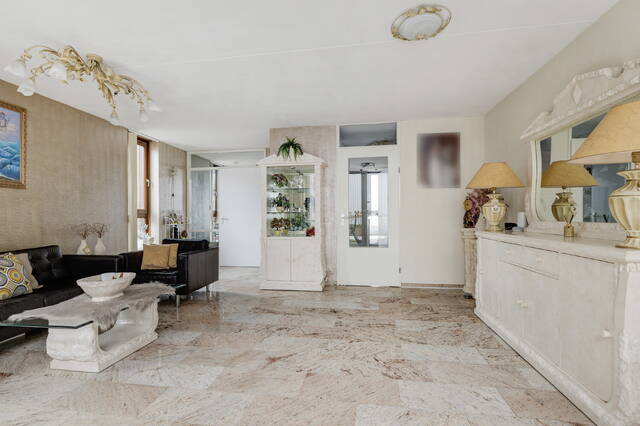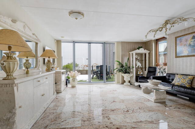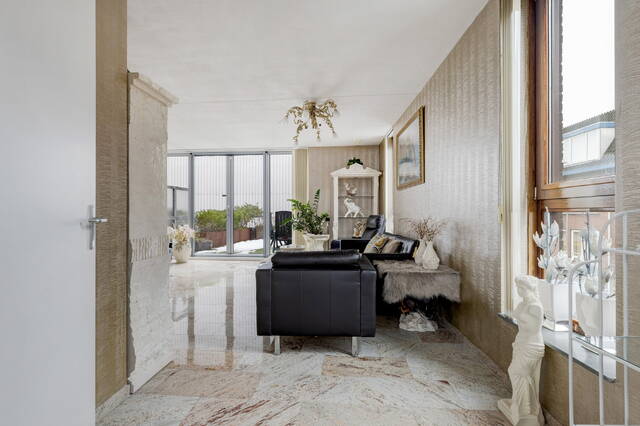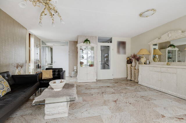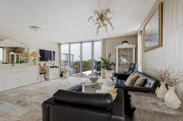 De woonkamer is licht en ruim en afgewerkt met een lichte granieten vloer voorzien van vloerverwarming. De wanden zijn afgewerkt met behang. Schuifdeuren met een hor geven direct toegang tot het terras, waardoor binnen en buiten mooi in elkaar overlopen.