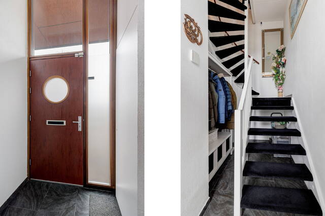 Eigen entree vanaf de straatzijde. Vanuit hier leidt een trap naar de eerste verdieping. In de hal is ruimte voor een garderobe en bevindt zich een praktische bergruimte onder de trap, ideaal voor extra opslag.
