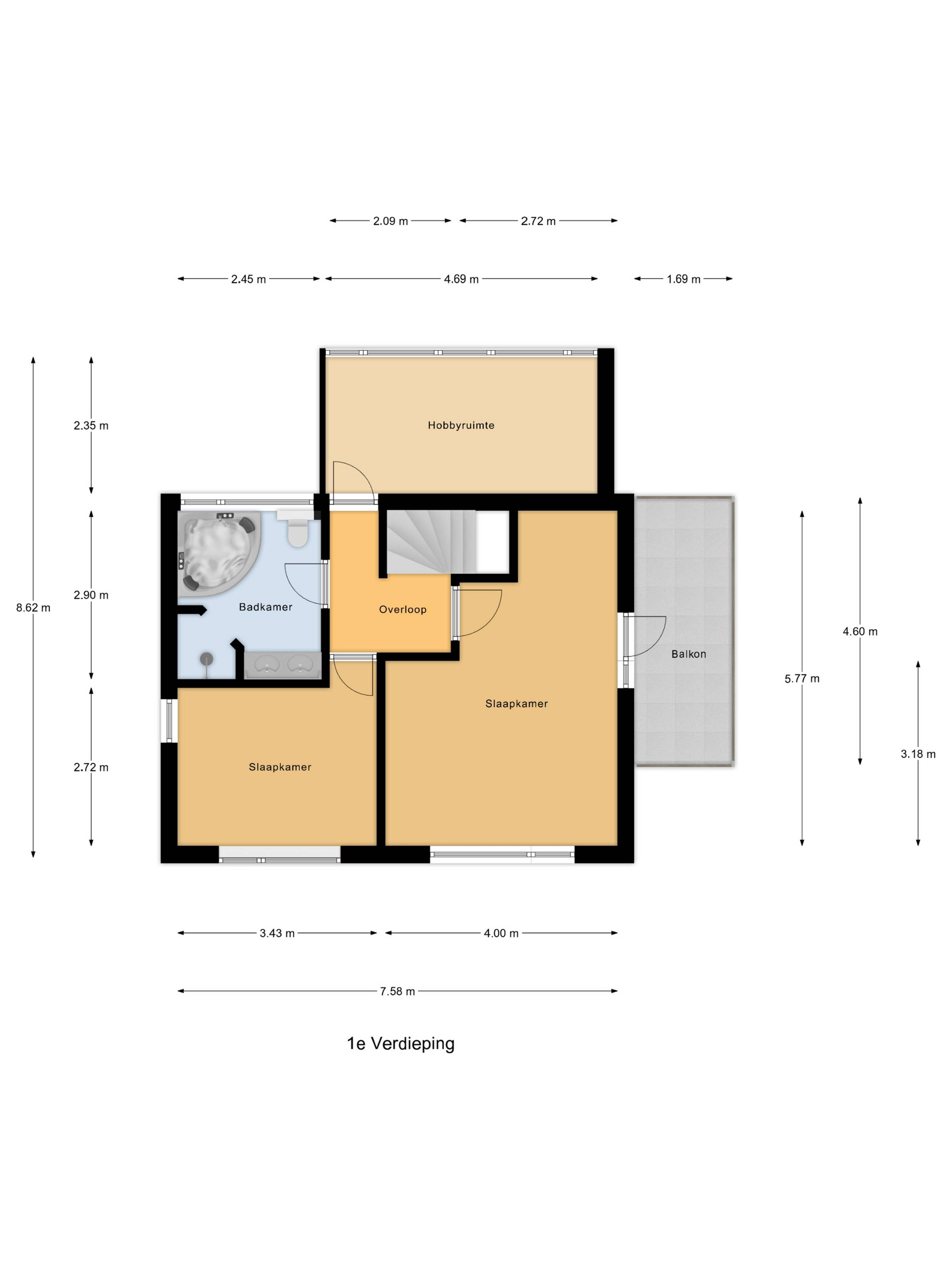 Op de eerste verdieping bevinden zich drie slaapkamers en de badkamer. De verdieping is prettig ingedeeld en voelt licht en ruim aan, mede door de goede verdeling van de kamers en de fijne lichtinval.