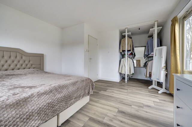 De tweede slaapkamer aan de voorzijde is eveneens goed van formaat en biedt toegang tot de zolder, die bereikbaar is via een vlizotrap. Deze extra ruimte zorgt voor praktische bergruimte en draagt bij aan het functionele karakter van de woning. Tevens is deze tweede slaapkamer voorzien van nieuwe airconditioning.
