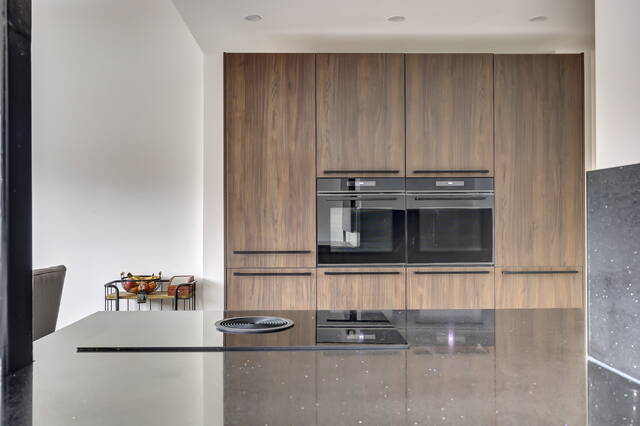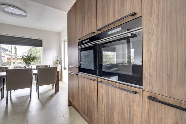De open keuken, vernieuwd in 2023, is aan de wand gesitueerd en loopt deels door in de woonkamer, waardoor er een open en ruimtelijk geheel ontstaat. Het kookgedeelte is voorzien van een inductiekookplaat met vier zones en een geïntegreerd afzuigsysteem. Daarnaast beschikt de keuken over een vaatwasser, koelkast en dubbele combimagnetron. De keuken is uitgevoerd in een natuurlijke donkerbruine kleurstelling met zwarte accenten en een antracietkleurige natuurstenen werkblad. Dankzij de vele kasten is er meer dan voldoende bergruimte voor servies, kookgerei en voorraad.