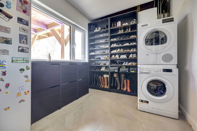 Dankzij het grote raam met uitzicht over de tuin valt er prettig daglicht binnen, waardoor de bijkeuken niet alleen functioneel is, maar ook aangenaam in gebruik.