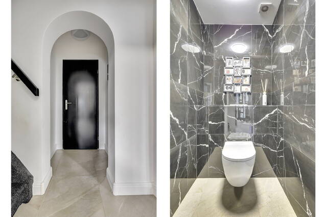 In de hal op de begane grond bevindt zich het toilet. Deze ruimte is modern uitgevoerd met een zwevend toilet en voorzien van mechanische ventilatie. Het toilet is volledig betegeld met marmerlook antraciettegels.