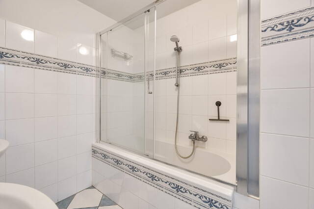De badkamer is volledig betegeld en ingericht met een ligbad, aparte douche, dubbele wastafel en radiator. Functioneel, netjes en compleet.
