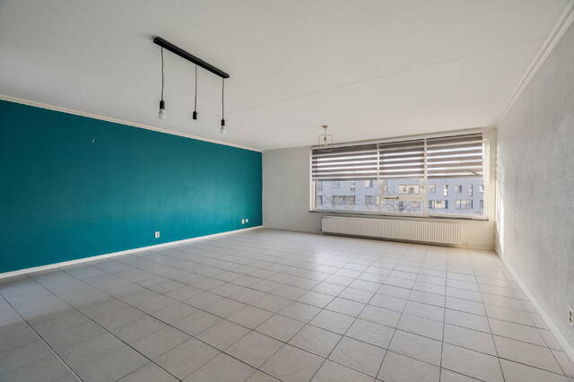 Dit is het hart van de woning. De woonkamer van 37 m2 is ruim opgezet en heeft lekker veel lichtinval door de grote raampartijen. Er ligt een nette en onderhoudsvriendelijke plavuizenvloer.