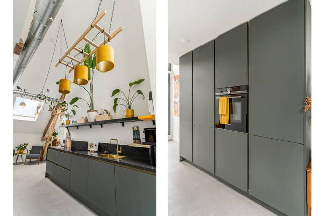 De open woonkeuken is hoogwaardig afgewerkt en van alle gemakken voorzien: een spoelbak, vaatwasser, kookplaat met geïntegreerd afzuigsysteem en een grote kastenwand met combi-oven, koelkast en vriezer.