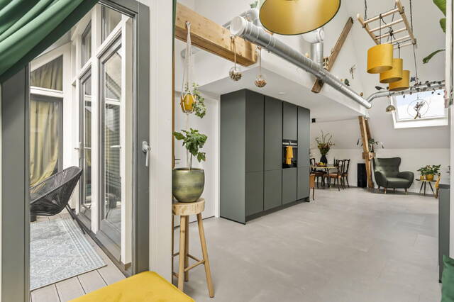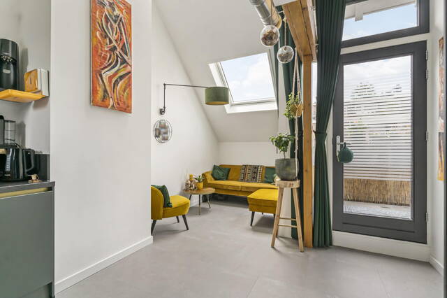 Dankzij de speelse indeling zijn er diverse mogelijkheden voor een eetgedeelte, meerdere zitplekken en een aparte zithoek met ruimte voor een comfortabele bank. De op het zuiden gelegen loggia biedt een heerlijke, zonnige zitplaats. De hoge plafonds en grote ramen zorgen voor een aangename en royale lichtinval in het gehele appartement.