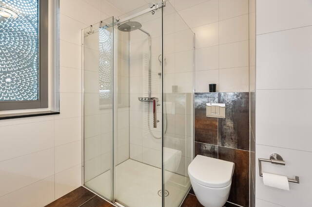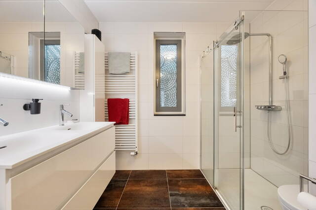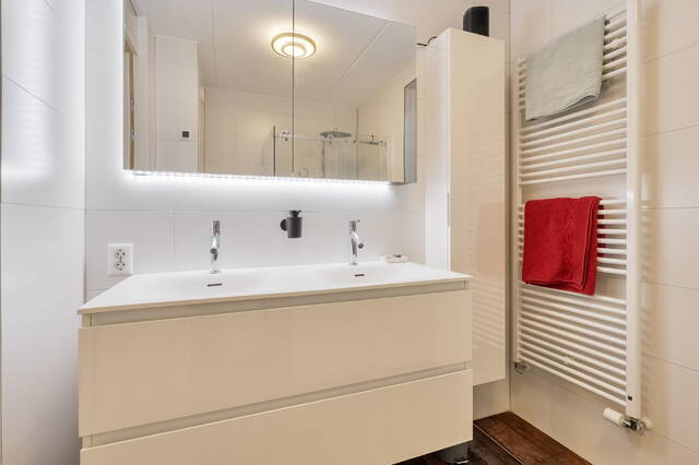 De badkamer aan de voorzijde is volledig betegeld in dezelfde stijlvolle kleurstelling als het toilet beneden. Hier vind je een dubbel wastafelmeubel met verlichte spiegelkast, een inloopdouchecabine, een tweede hangend toilet en elektrische vloerverwarming.