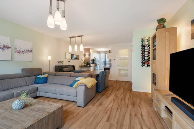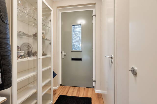 De uitgebouwde woonkamer is bereikbaar via een stijlvolle glazen paneeldeur. Hier valt direct de ruimte en het licht op. De pvc-vloer met vloerverwarming zorgt voor optimaal comfort en de wanden zijn strak afgewerkt met renovlies behang. Dankzij de brede schuifpui staat de woonkamer in directe verbinding met de achtertuin.