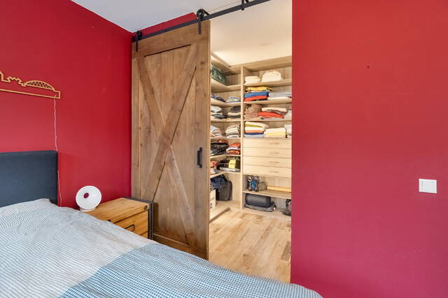 Slaapkamer 1, gelegen aan de achterzijde, beschikt over grote raampartijen en een royale inloopkast met stoere houten schuifdeur en automatische verlichting. De indeling van de inloopkast blijft achter. De kamer is afgewerkt met laminaat en renovlies wanden en voorzien van een tv-aansluiting. Dankzij de royale breedte bestaat hier de mogelijkheid om de kamer op te splitsen in twee slaapkamers.