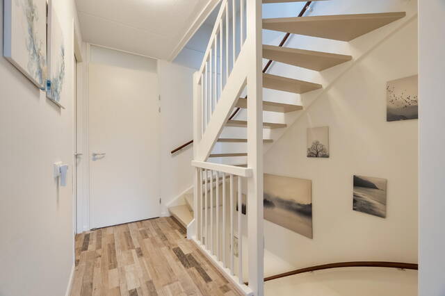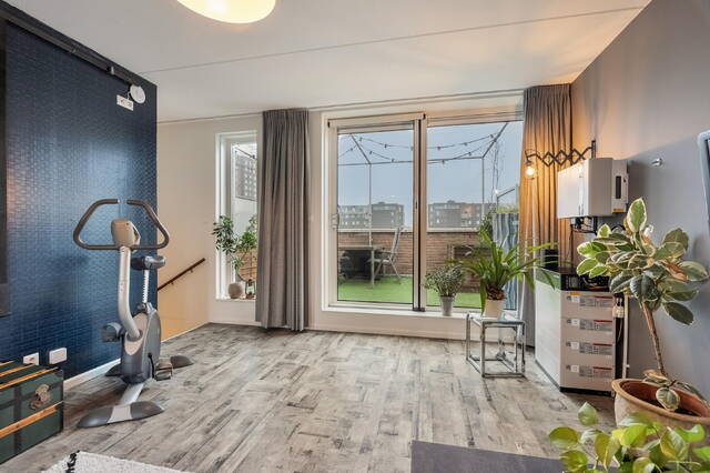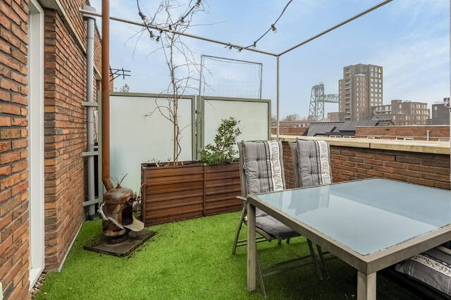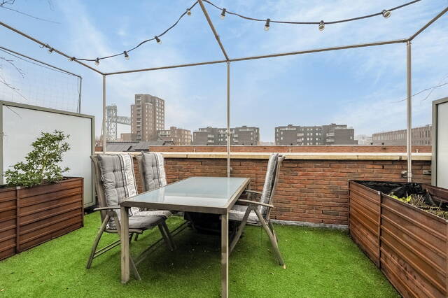 Boven de trap is een grote vaste kast gerealiseerd voor extra bergruimte. Via de brede schuifpui bereik je het riante dakterras op het noordwesten. Hier geniet je van veel privacy, cortenstalen plantenbakken en een weids uitzicht over de omgeving met zicht op De Hef, een uniek Rotterdams decor dat nooit verveelt.