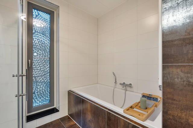 De tweede badkamer is compleet uitgevoerd met een ligbad, aparte inloopdouche en een wastafelmeubel met spiegelkast, ideaal voor gezinnen of gasten.