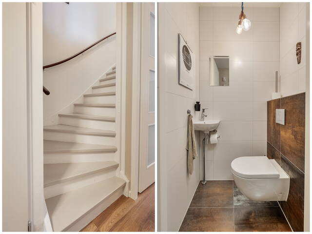 Via de entree kom je in de hal met meterkast, trapopgang en een modern afgewerkte toiletruimte met hangend toilet en fonteintje. De ruimte is volledig betegeld met grote witte wandtegels en roestbruine vloertegels, wat zorgt voor een warme en eigentijdse uitstraling.