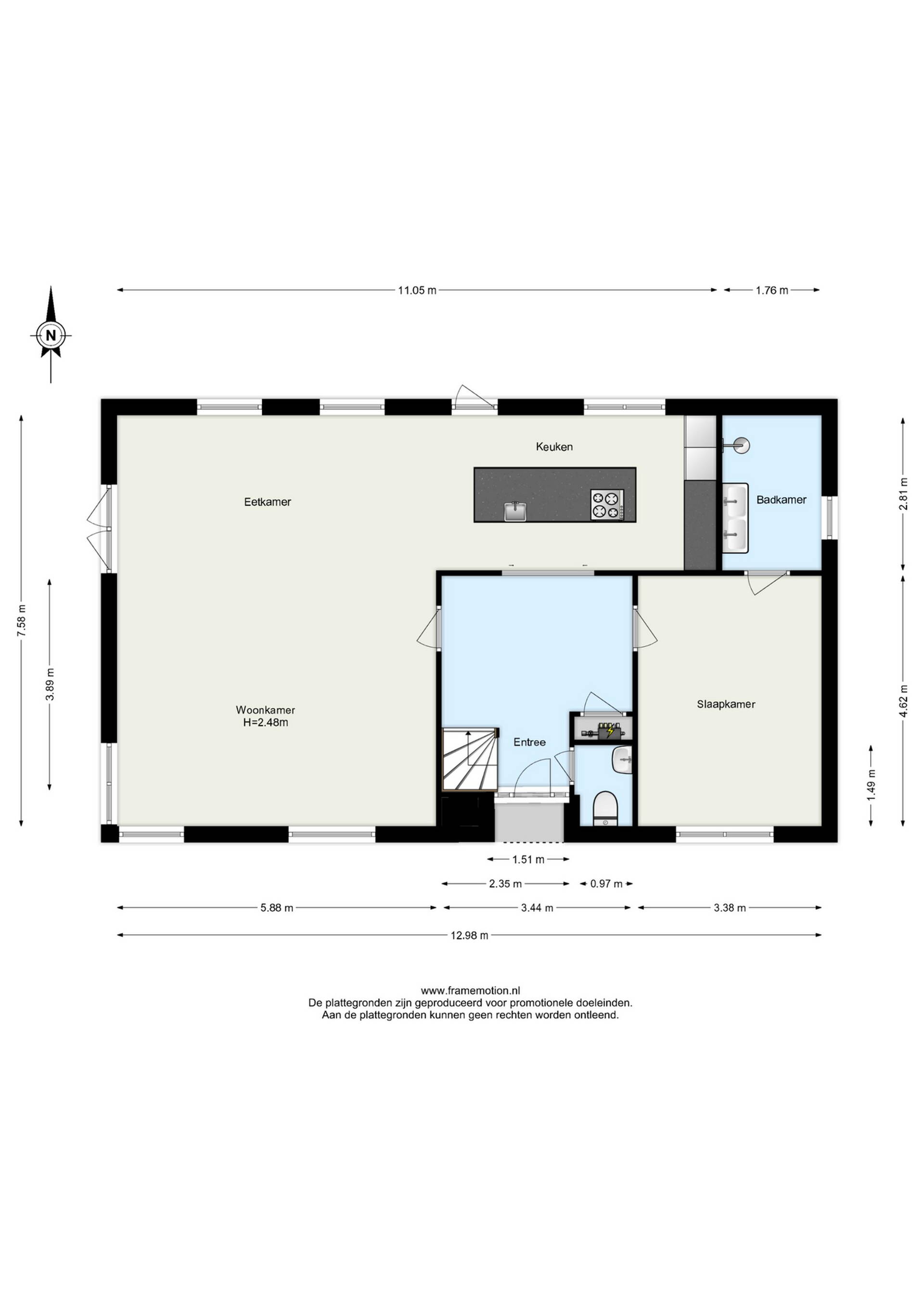 Via de ruime entreehal met de garderobe, meterkast en de toiletruimte betreedt u deze modern afgewerkte woning. De toiletruimte is strak uitgevoerd met glad stucwerk, een hangend toilet en fonteintje. Vanuit de hal heeft u toegang tot de woonkamer, slaapkamer met badkamer ensuite en de keuken, bereikbaar via prachtige zwarte glazen schuifdeuren die direct zorgen voor een stijlvolle en lichte verbinding tussen de ruimtes.