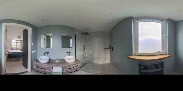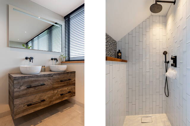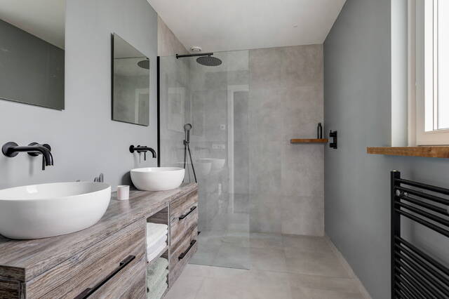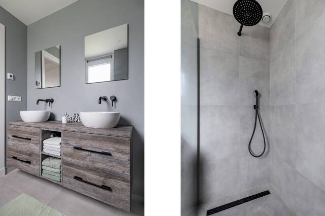 De badkamer is een waar wellnessgevoel: een riante inloopdouche met zwarte regendouche, een dubbel wastafelmeubel met houten accenten en moderne inbouwverlichting. Afgewerkt met grote grijze wand- en vloertegels, glad stucwerk en mechanische ventilatie (automatische vochtmeting).