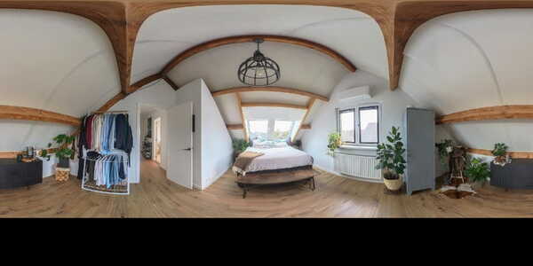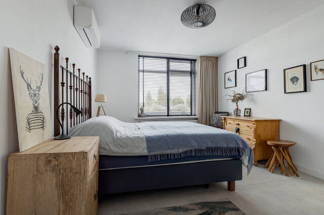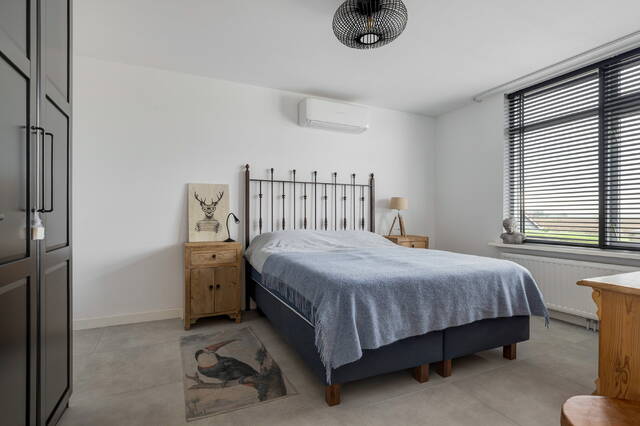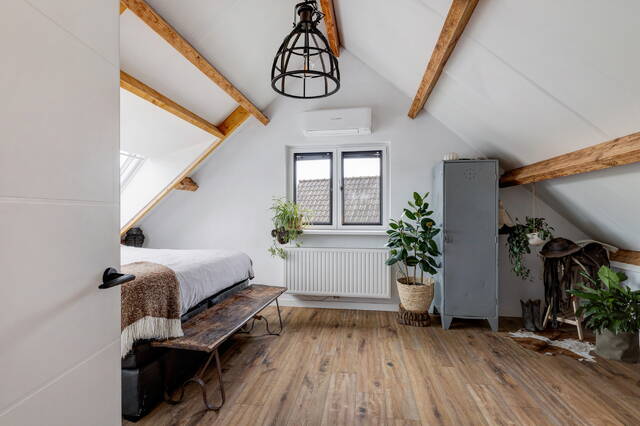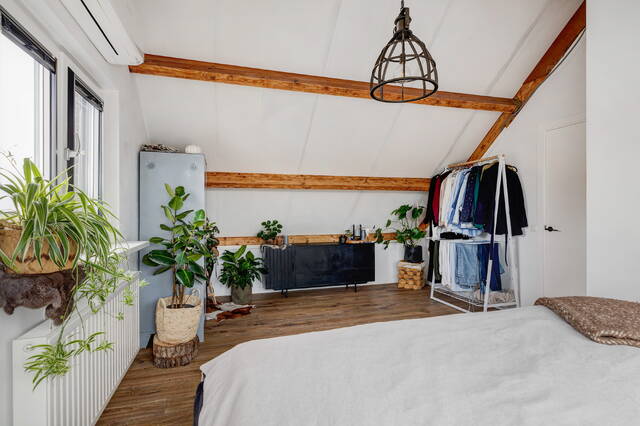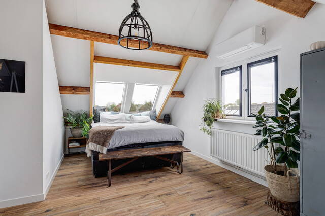 Slaapkamer 1 is voorzien van twee kunststof Velux dakramen met HR++ glas en elektrische rolluiken, houten balken, laminaatvloer en airconditioning.